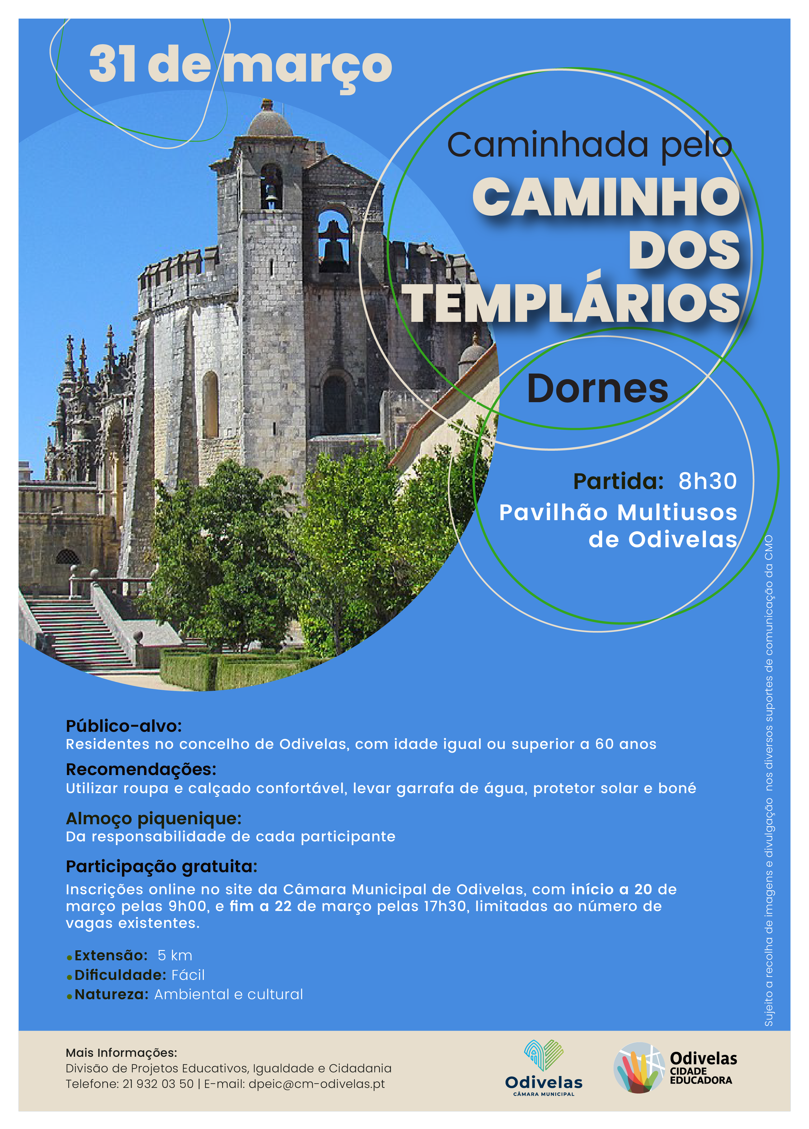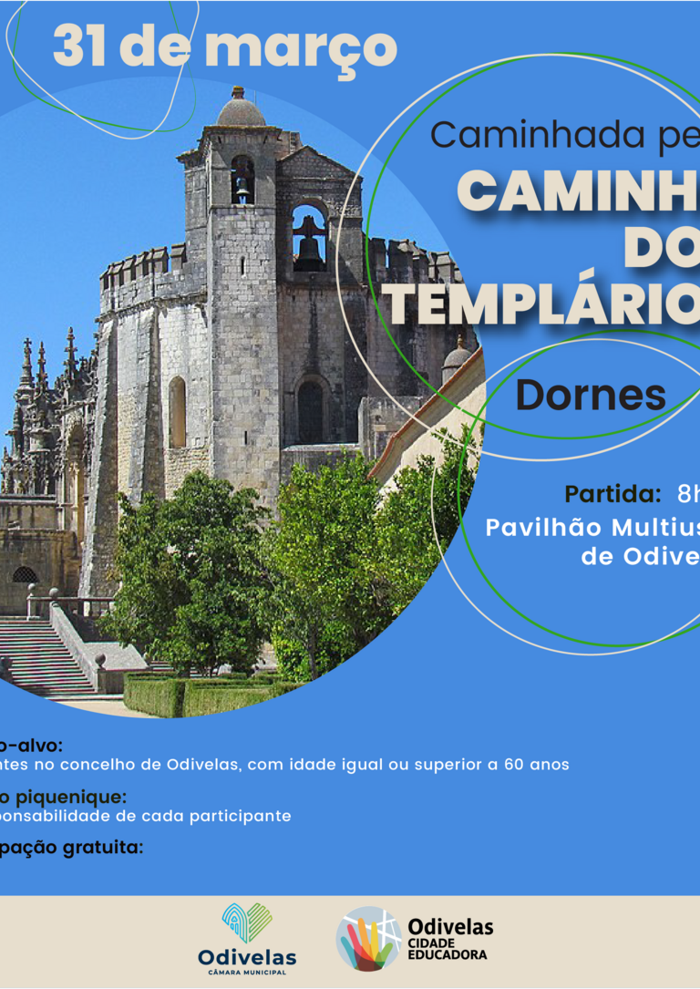 A Câmara Municipal de Odivelas promove, no próximo dia 31 de março, entre as 08h30 e as 18h00, uma atividade que consiste numa caminhada pelo Caminho dos Templários, em Dornes, uma aldeia pitoresca onde o tempo parece ter parado, situada nas margens do rio Zêzere e com profundas ligações à Ordem Templária em Portugal. O programa inclui ainda um almoço piquenique e uma visita ao conjunto monumental do Convento de Cristo e ao Castelo de Tomar.